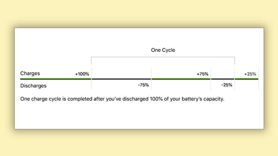 با شنیدن عبارت سیکل شارژ باتری ، ممکنه فکر کنین که هر سیکل شارژ به زمانی گفته میشه که باتری گوشی شما بهطور کامل تخلیه میشه، یعنی میزان شارژ اون به صفر میرسه؛ یا یه چرخه به هر دفعهای که شما گوشی خودتون رو به شارژ متصل میکنین گفته میشه؛ اما باید بگم که اینطور نیست! درواقع طبق تعریفی که خود کمپانی اپل ارائه میده، هر سیکل شارژ معادل استفاده از 100 درصد ظرفیت باتری گوشیه؛ به عبارت دیگه هر دفعه که شما 100 درصد از شارژ باتری گوشیتون رو استفاده میکنین یه چرخه باتری حساب میشه البته به این معنی نیست که در یک بازه شارژ گوشی از 100 به صفر برسه. برای درک بهتر بذارین از مثالی استفاده کنیم که تو سایت اپل هم آورده شده. فرض کنین گوشی شما 100 درصد شارژ شده و شما در طی روز 75 درصد از اون رو استفاده میکنین و شب مجدد گوشی رو بهطور کامل شارژ میکنین تا به 100 درصد برسه و در طی روز بعد از 25 درصد دیگه از ظرفیت شارژ باتری گوشی استفاده میکنین؛ پس مجموع ظرفیت باتری که در طی دو روز استفاده کردین برابر با 100 هست و یک سیکل شارژ باتری رو شکل میده. با مشاهده تصویر زیر بهتر میتونین مواردی رو که گفتیم درک کنین.