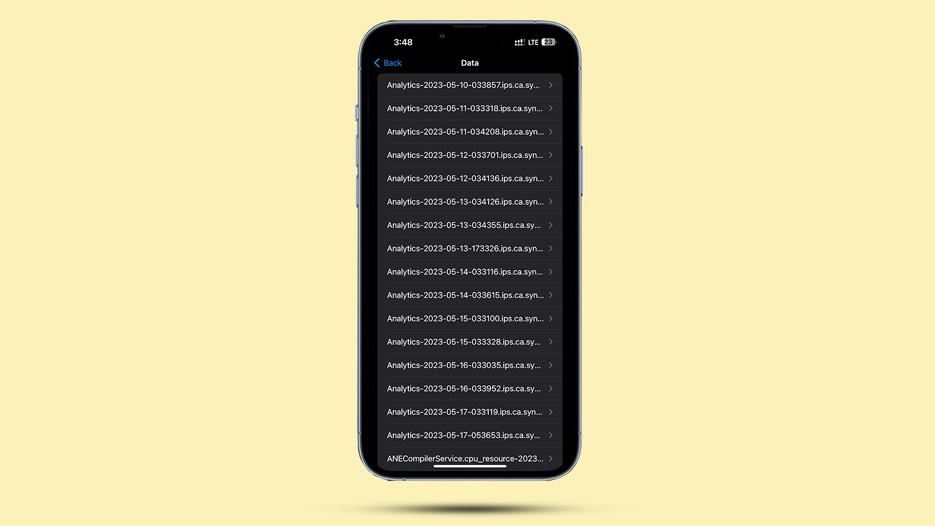 بعد از اینکه گزینه Analytics Data رو انتخاب کردین، با تعدادی فایل مواجه میشین که از هرکدوم اونا میتونین برای بدست آوردن اطلاعات خاصی در مورد گوشی آیفون و یا حتی عیبیابی هم استفاده کنین. اسم فایلی که ما دنبالش هستیم از کلمه Analytics و یک تاریخ تشکیل شده، پس شما باید دنبال فایلی بگردین که با کلمه Analytics شروع میشه و نزدیکترین تاریخ رو داره. اگه هم تعداد فایلها زیاد بود و شما نتونستین تو نگاه اول فایل مورد نظرتون رو پیدا کنین، میتونین از کادر جستوجو کلمه Analytics رو سرچ کنین.