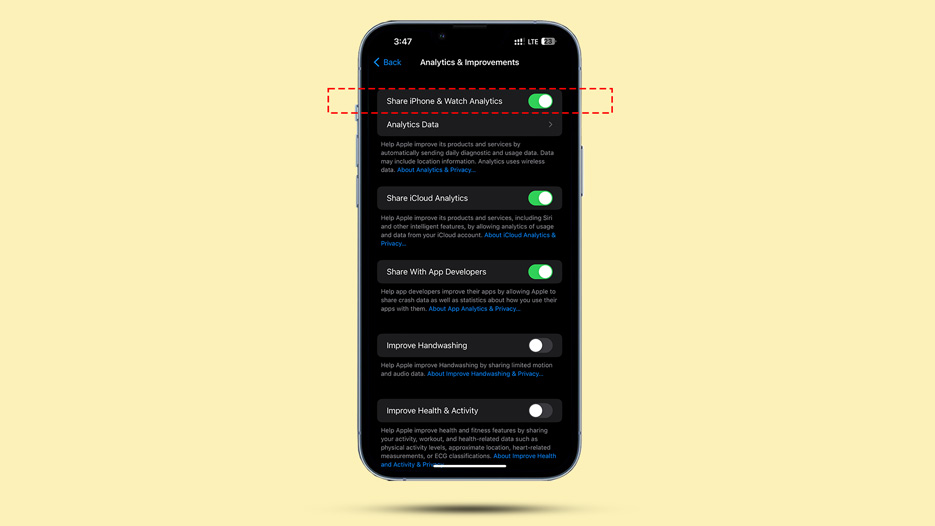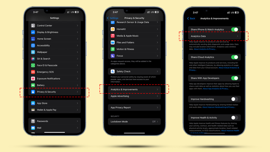بعد از همه توضیحاتی که درباره چرخه باتری آیفون گفتیم، حالا میخوایم بریم سراغ اینکه شما چطوری میتونین تعداد سیکل شارژ باتری گوشی آیفون خودتون رو پیدا کنین. برای این کار کافیه به قسمت Setting برین و از قسمت Privacy ، گزینه Analytics & Improvement رو پیدا کنین و سپس گزینه Analytics Data رو انتخاب کنین.