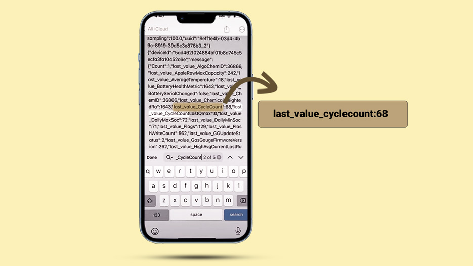 بعد از اینکه فایل رو پیدا کردین، اونو باز کنین. بعد از باز کردن فایل ممکنه با کلی عبارت روبرو بشین که براتون نامفهوم باشه! اصلاً نگران نباشین چون ما فقط قراره یه عدد رو که همون تعداد سیکل شارژ باتری هست از این فایل پیدا کنیم. برای این کار هم فقط لازمه شما تمام محتویات داخل فایل رو انتخاب و در برنامه Notes گوشی خودتون کپی کنین. سپس در برنامه Notes، با زدن سه نقطهای که در سمت راست و بالای صفحه قرار داره گزینه Find in Note رو انتخاب کنین. حالا کافیه عبارت last_value_CycleCount رو جستوجو کنین. عددی که در مقابل این عبارت قرار میگیره، همون تعداد چرخه باتری آیفون هست.