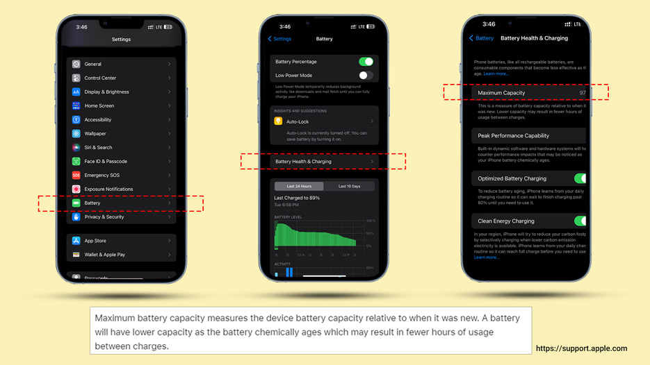 طبق چیزی که کمپانی اپل در وبسایت support.apple.com مطرح میکنه، حداکثر ظرفیت باتری که شما در این قسمت مشاهده میکنین نسبت به ظرفیت باتری در زمان تولید هست و بعد از افزایش عمر شیمیایی باتری، کمکم این حداکثر ظرفیت کاهش پیدا میکنه؛ پس میتونیم بگیم اگه شما همه راهکارها رو هم برای افزایش طول عمر باتری گوشیتون انجام بدین، بالاخره بعد از یه مدتی عمر باتری رو به پایان میره و دیگه کارایی سابق خودشو نداره و شما مجبورین باتری رو تعویض کنین که این یه امر کاملا طبیعیه!