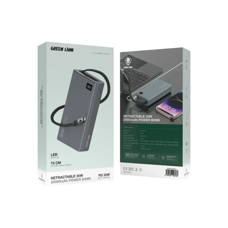 Green Lion Retractable 20000mAh یک پاوربانک کامل برای کاربرانی است که به دنبال دوام بالا و سرعت شارژ عالی هستند.
