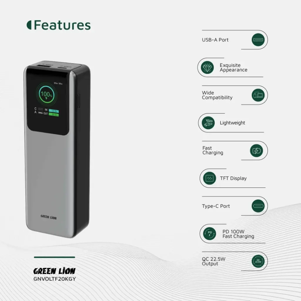 پاوربانک Green Lion Voltura با ظرفیت ۲۰۰۰۰ میلیآمپر ساعت و پشتیبانی از شارژ فوقسریع ۱۰۰ واتی، یکی از قدرتمندترین گزینهها برای کاربران حرفهای، گیمرها و دارندگان لپتاپ است. طراحی مقاوم، پورتهای متنوع و فناوریهای ایمن، این محصول را به همراهی بیرقیب برای زندگی روزمره و سفر تبدیل کردهاند.
